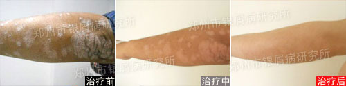 这个时候范某再也不相信小门诊、小医院了,决心找个正规、专科医院进行治疗,通过亲戚推荐来到郑州市银屑病研究所。了解到范某十年求医的艰辛历程,主治医生也非常感慨,太多的患者因为对银屑病没有足够的认识致使疾病得不到及时的治疗,范某来到郑州市银屑病研究所的时候病情已经处于迅速发展的进行期,专家经过分析检测数据,制定了康复方案,采用“蓝氧自体免疫激活疗法”,中西医结合,辨证治疗,治疗全程非激素,绿色安全,避免了激素药品对患者身体的伤害。范某十来年病情反反复复就是应用了过多的激素类药物造成的。